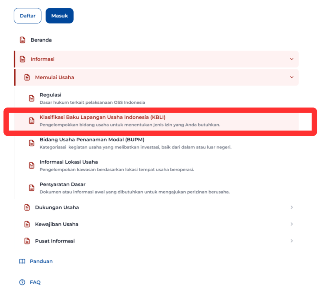 ② 「Informasi」→「Memulai Usaha」→「Klasifikasi Baku Lapangan Usaha Indonesia(KBLI)」を選択