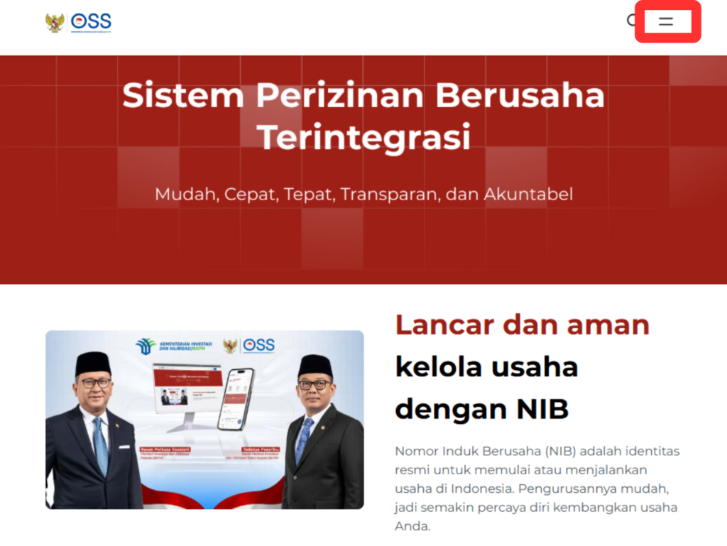 ① oss.go.id にアクセスし、画面右上のメニュー(横線2本)を選択
